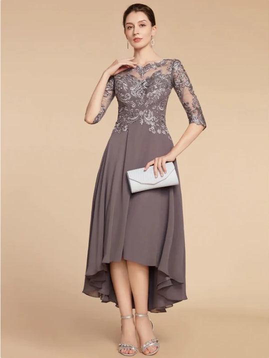 Luolandi A-Line Mother of the Bride Dress Formal Wedding Guest Elegant Bateau Neck Tea Length Satin 3/4 Length Sleeve with Beading