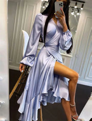 Luolandi A-Line Wedding Guest Dresses High Low Dress Party Wear Semi Formal Asymmetrical Long Sleeve V Neck Satin with Ruffles Pure Color Party Dress