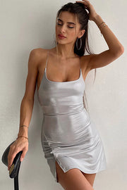 Silver Spaghetti Straps Short Tight Cocktail Party Dress With Split