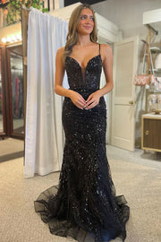 Black V Neck Sequin Lace Mermaid Long Prom Dress