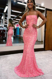 Charming Mermaid Straps Coral Sequins Lace Long Prom Dresses
