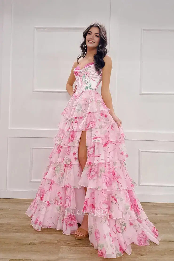 Luolandi Gorgeous A Line Sweetheart Strapless Sleeveless Tiered Long Formal Prom Dress With Slit Sexy Graduation Dress Charming Party Evening Gowns