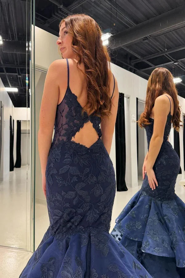 Navy Blue V Neck Mermaid Long Prom Dresses with Appliques