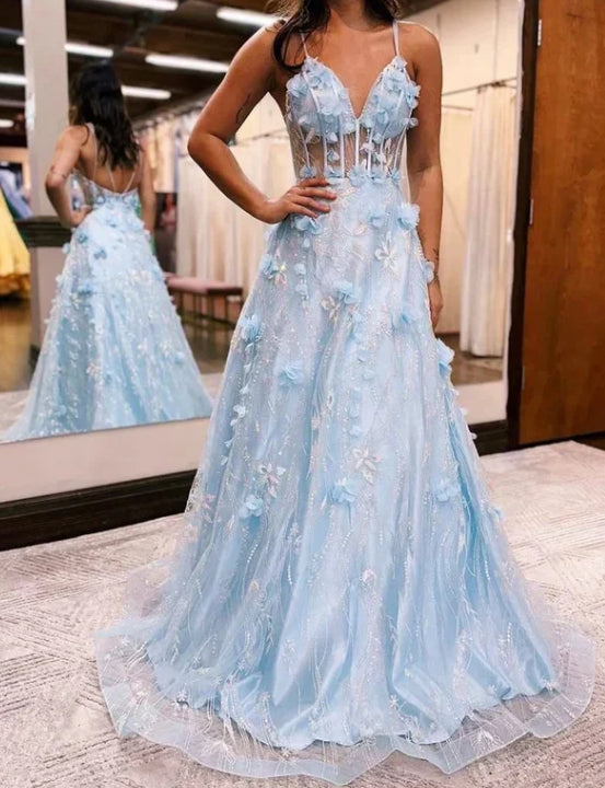 Princess Light Blue 3D Floral Lace V-Neck A-Line Long Prom Dress