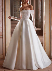 Off-The-Shoulder A-Line Wedding Dress With Long Sleeves And Pockets Featuring Sequins