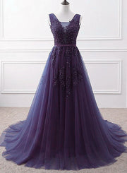 Purple Tulle Beaded Long Formal Party Dress Evening Dress A Line Sleeveless